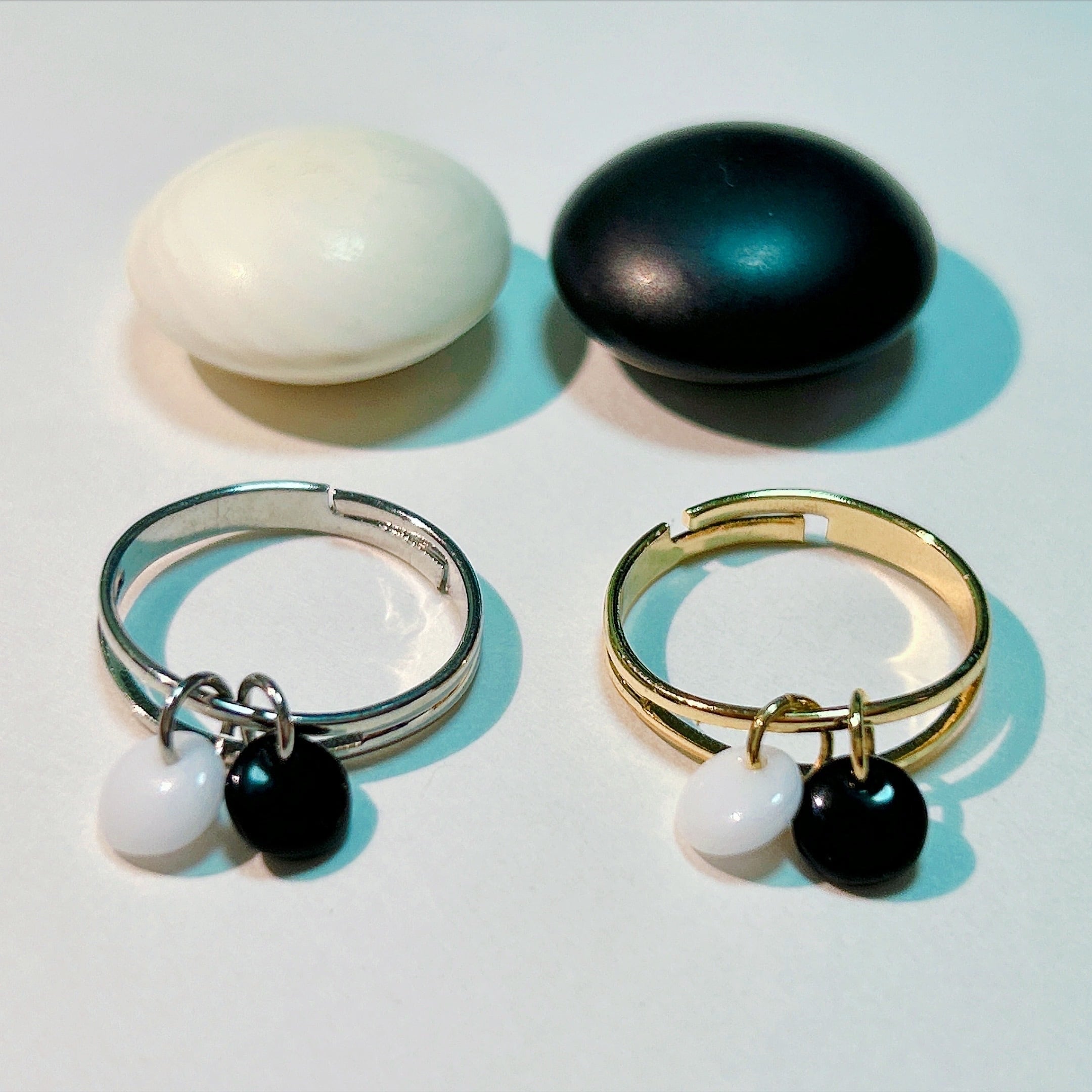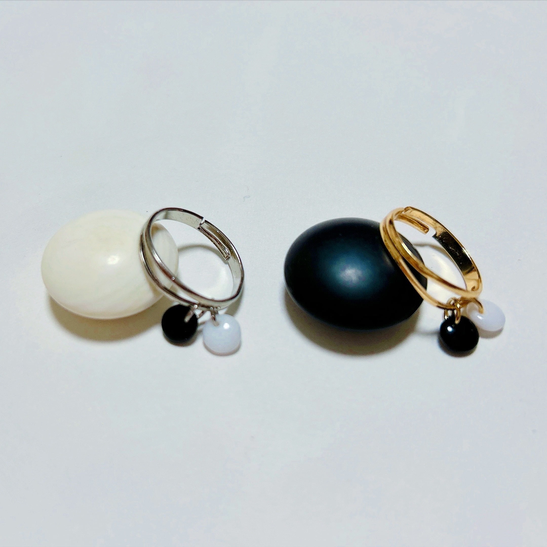 ミニ碁石がゆらゆら可愛い指輪です。